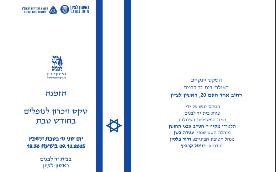 החודש ייערך טכס ההנצחה ביום שני ט' בטבת תשפ"ו (29.12.25) בשעה 18:30.