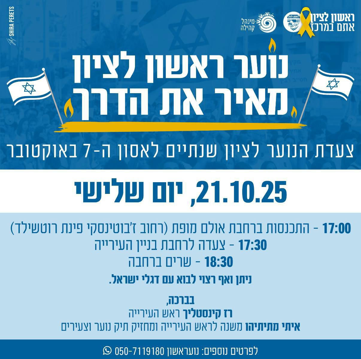 עיריית ראשון לציון, בהובלת אגף הנוער והצעירים במינהל קהילה, תקיים צעדה מיוחדת לציון שנתיים לשבעה באוקטובר, תחת הכותרת "נוער ראשון לציון מאיר את הדרך".