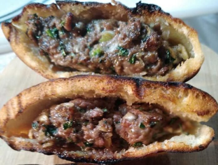 לוקחים מסה של קבב טורקי כ- 100 גרם ומכניסים לחצאי פיתה או לפיתה קטנה שלמה.
